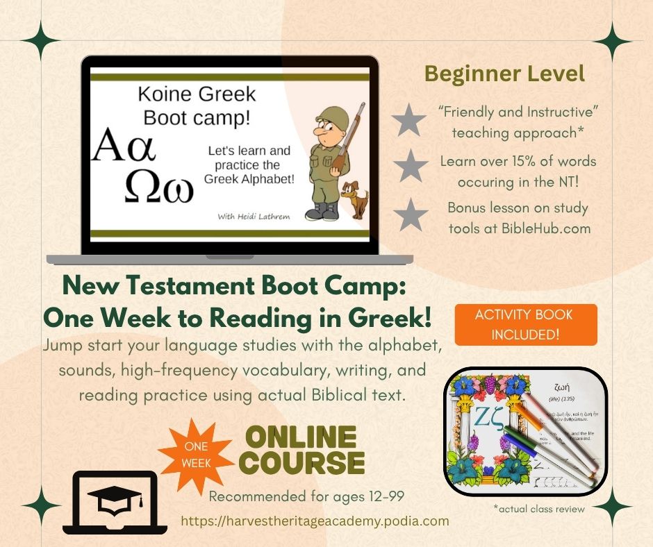 Lesson One serves as an introduction to the language, familiarizing learners with the strange new letters and how they should sound. Subsequent lessons provide additional practice a few letters at a time. Printable worksheets will be provided for each letter containing: 1) a high-frequency NT noun starting with that letter, 2) a sample NT verse containing the high-frequency words for reading practice, 3) an optional coloring activity, and 4) lined pages for handwriting practice. Class time will consist of instruction, review, reading, and writing practice. The final lesson includes instruction and orientation on accessing the text of the New Testament online and using the tools found at Biblehub.com (a free online resource).